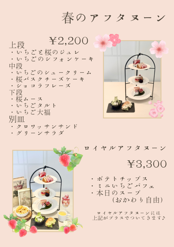 そしてアフタヌーンは春をふんだんにお楽しみいただける桜といちごづくしとなっております!